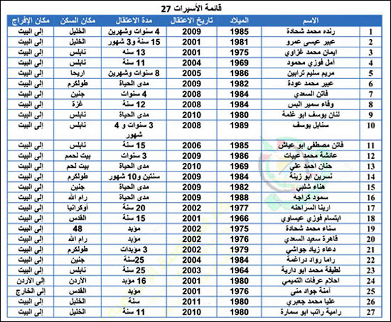 ونشرت أيضا مصلحة السجون الإسرائيلية نفس القائمة على موقعها على الإنترنت، ومن بين أبرز الأسماء أحلام التميمي التي كانت تعمل مراسلة لمحطة تلفزيون محلية قبل الانضمام إلى الجناح المسلح لحماس.