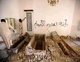 وفي إحدى الصور يظهر شخصان يقفان على رأس أحد القبور بعد نبشها، فيما كتبت على جدار الفناء عبارة "لجنة هدم الأصنام". ولم يتم التأكد من صحة هذه الصور من مصدر مستقل. وتأتي هذه الواقعة بعد نحو أسبوعين من مقتل الزعيم الليبي معمر القذافي ونجله المعتصم على أيدي الثوار الليبيين، قبل أن يتم دفنهما بعد ذلك في عمق الصحراء الليبية في مراسم سرية، بعدما أقيمت الصلاة عليها.