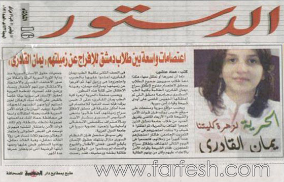 منذ 3 أسابيع تقريبا، وبالتحديد يوم 3 الشهر الجاري، قام 10 من الشبيحة بخطف طالبة عمرها 18 سنة، ويسميها زملاؤها "زهرة كلية الطب" وأحيانا "زهرة دمشق" وآخرون يلقبونها "ياسمينة دمشقية" لأن يمان القادري، برأي زملائها، مثالية الأخلاق وإحدى أجمل طالبات جامعة دمشق. حيث اعتقلوها هي وزميل لها على باب الكلية التي تدرس فيها، لأنها كانت تشارك بمظاهرة للطلاب ضد النظام، وساعدتهم على الاعتقال إحدى الشبيحات على مرأى من الجميع، ثم نقلوهما معا إلى مركز احتجاز، وهناك امتثلوا للوسوسات فأطلقوا سراح زميلها الذي كان ناشطا بالمظاهرة أكثر منها، فتحولت الحال عندها من اعتقال الى خطف.