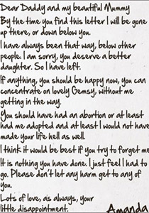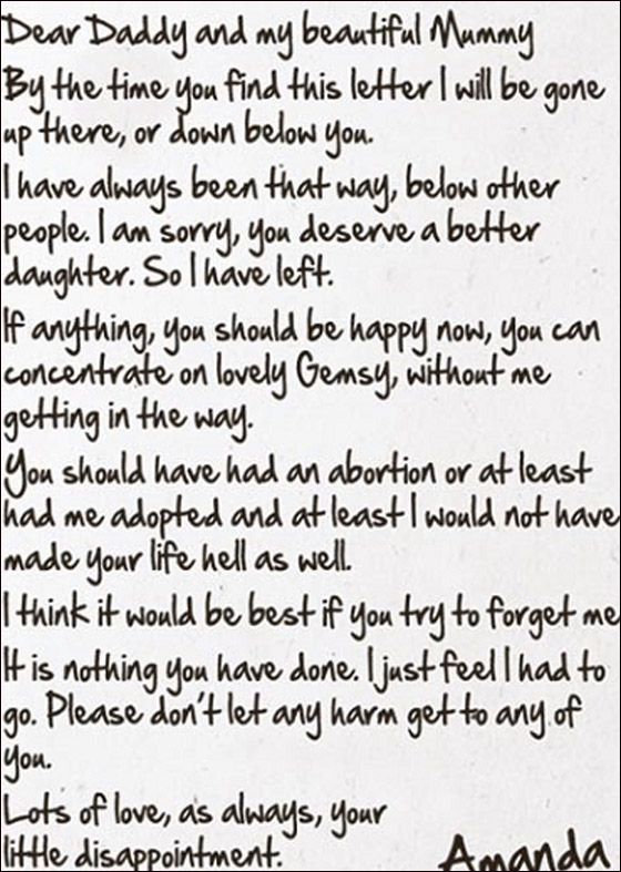 بعد ايام قليلة من اختفائها، عثرت والدتها على رسالتين كتبتهما ميلي الى والديها، تعبر فيهما عن خيبة املها من نفسها، مدعية ان حياة والديها ستكون افضل من دونها. وقد ختمت الرسالة بـ"خيبة املكم الصغيرة، اماندا(وهذا اسمها الحقيقي)."