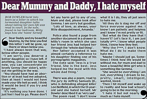 فعندما وجدت جثتها ملقاة على شارع في انجلترا، كانت هذه صدمة للجميع، ولكن ليس لوالدها. "بوب داولر" (59 عاما) كان على علم بمشكلة ميلي، فلطالما حدثته عن كرهها لنفسها، انها تعتبر نفسها "خيبة امل" من جميع النواحي، ولكنه كان على امل انها مشاكل فتاة مراهقة لا اكثر.