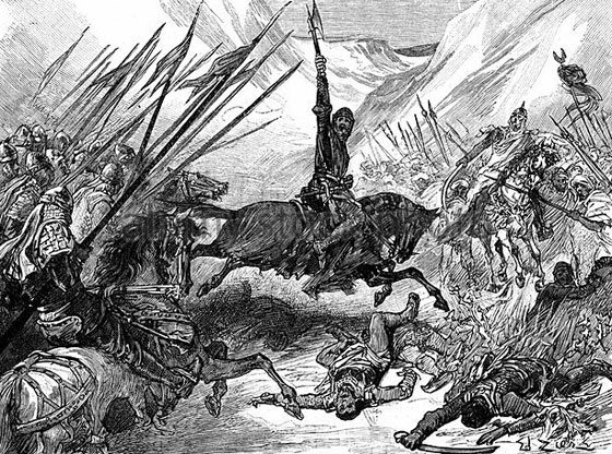 وقد جرى هذا في معركة ارسوف خلال الحملة الصليبيّة الثالثة (1189 - 1192)، والتي جرت بين قوات ريتشارد قلب الأسد وقوات صلاح الدين الأيوبي. كان قوات الأوروبيّين بقيادة ريتشارد قلب الأسد قد أُمطِرَت بوابل من السهام لساعات طوال، حين حاولت قوات المسلمين أن تستدرجهم إلى خارج تشكيلاتهم المتراصّة. وبشكل فجائيّ قام ملوك أوروبا بهجوم خاطف على مشاةِ الجيش الإسلامي وسلاح الفرسان الخفيف. وقد أتى أثر هذا الهجوم دراماتيكيّاً وكبيراً، فقد انكسرت القوات الأيوبية وفرّت من الساحة أو سحقت لعِظم وقع الهجوم عليها.