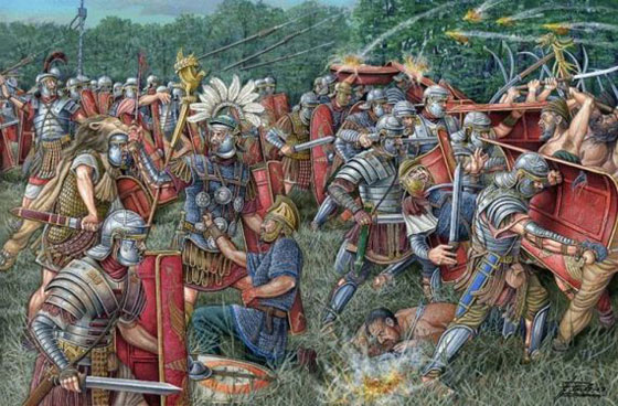 1- الهجوم المباغِت: اسنينغ - غابة تويتوبورغ (العام 9): في العام التاسع للميلاد، وقع حاكم جيرمانيا الروماني فاروس، في كمين أعدّه الضابط الروماني، الجرماني الأصل آرمينيوس، وهو ضابط في وحدة سلاح الفرسان الاحتياطي. كان فاروس يقود 3 فيالق عابراً غابة تويتوبورغ لإخضاع إحدى الثورات الجرمانية، وعند انسياب قواته المكوّنة من 20 ألف جندياً على امتداد الطريق، قام آرمينيوس بمباغتتهم بكامل قواته. وقد قاوم الرومان بصعوبة لأيام إلى أن تمكّن الناجون من التجمع مرة أخرى في تلال كلكريس، شمالي المدينة التي تعرف اليوم باسم اوزنابروك.