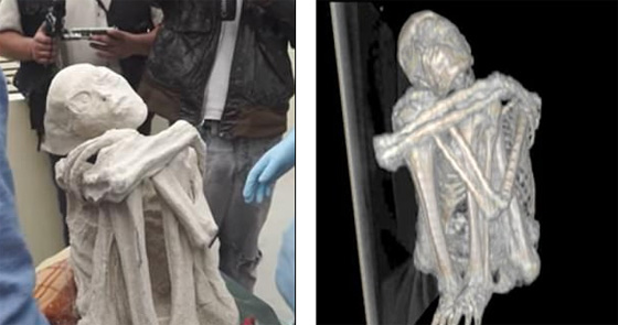ويبدو أن هذا الشكل ليس مومياء، كما قال عدد من المشككين، ومن بينهم، جيمي موسان، وهو صحفي سابق مشهور باشتراكه في العديد من خدع أصحاب نظريات المؤامرة، وكان جزءا من فريق أبحاث المومياء Peruvian. وفي مايو 2015، عرض موسان شرائح فوتوغرافية، مدعيا أنها تصور كائنا غريبا، نجا من تحطم صحن طائر (Roswell)، عام 1947. وكُشف عن هذه الصور في مؤتمر عُقد في المكسيك، ويقال إن عمليات البحث الدقيقة أكدت أن الصور تعود إلى مومياء.