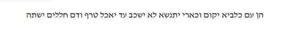 وترجمة النص التوراتي أعلاه إلى العربية هي: "شعب كالأسد يقوم.. وكالليث يشرئب.. لا ينام حتى يأكل فريسته ومن دم ضحاياه يشرب".