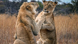 صور صادمة: شجار بين اسدين شقيقين وأحدهما يعض ذيل الآخر في معركة ..
