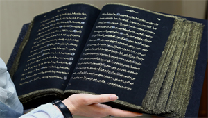 صور أول مصحف مكتوب بخيوط ذهبية وفضية على قماش حرير