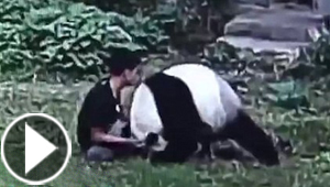 سائح يقتحم حظيرة باندا عملاق ويتعارك معه لابهار صديقتيه.. ..