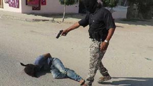 صور مؤلمة.. داعشي يعدم خفيرا مصريا وسط الشارع