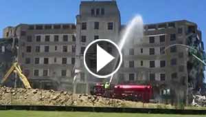 شاهد اغرب طريقة لهدم مبنى ضخم.. سيارة اطفاء ومدفع ماء