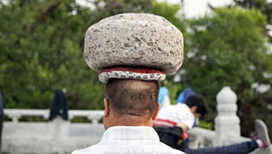 صور رجل صيني يتجول بصخرة على راسه لكي يخسر وزنه