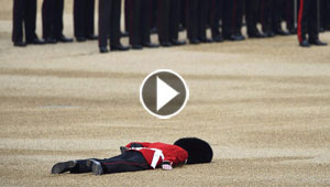صور حارس ملكي بريطاني ينهار اثناء استعراض بسبب قبعته