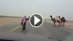 فيديو مثير.. رجل يوقف السيارات بسلاح رشاش لكي تعبر الابل ..
