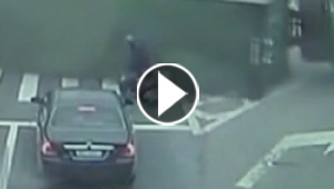شاهد لحظة سقوط شاحنة على راكب دراجة نارية ونجاته باعجوبة