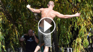 فيديو لمغامر امريكي جريء يمشي على حبل فوق نهر مليء ..