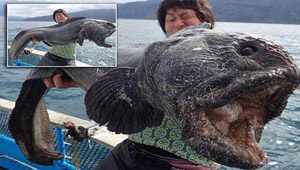 صورة ذئب البحر الضخم في قبضة صياد ياباني