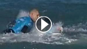 يالفيديو.. بطل العالم في ركوب الامواج يصارع قرشا بالبث ..