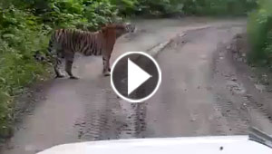 مواجهة من الاساطير بين نمر وركاب سيارة في غابة.. شاهد ما حدث ..