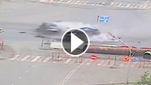 نجاة راجل باعجوبة من حادث تصادم سيارتين مروع.. لقطات حية ..