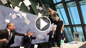 فتاة تخرق سكينة البنك المركزي الاوروبي وتهتف لانهاء ..