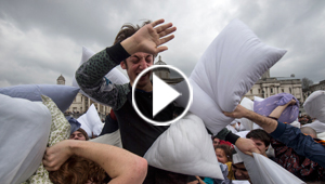 بالفيديو من لندن.. محاربون من نوع اخر يخوضون معارك الوسادات ..