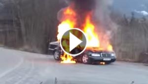 بالفيديو.. سيارة مشتعلة تتحول الى كرة لهب متحركة كادت توقع ..