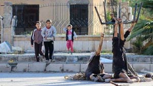 اطفال داعش يلهون حول اجساد علقها تنظيمهم في دير الزور.. صور ..