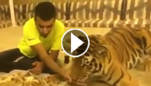 بالفيديو.. شاهد كيف تناول النمر الطعام من يد الشاب وشارك الضيوف ..
