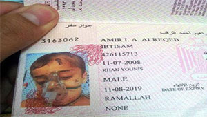 صورة على جواز السفر لطفل فلسطيني مصاب ومتصل بجهاز تنفس