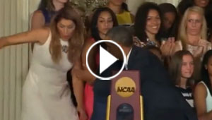 بالفيديو.. سقوط سيدة من على المنصة وهي تتحدث مع اوباما