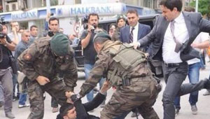 بالصور.. مساعد اردوغان يركل متظاهرا بقوة وهو على الارض