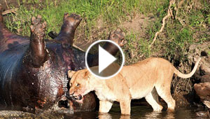 بالصور.. صراع شرس بين لبؤة وتمساح على جيفة فرس النهر