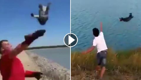 فيديو ليس لاصحاب القلوب الضعيفة: شاب يلهو بإلقاء كلب في بحيرة ..