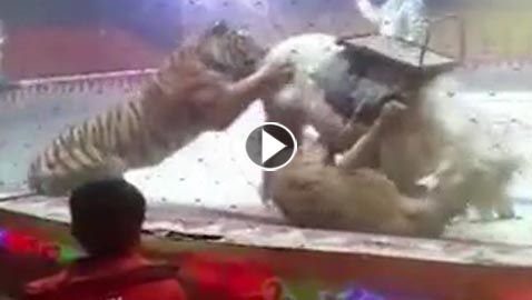 فيديو مروع .. حصان يتعرض لهجوم شرس من أسد ونمر في سيرك