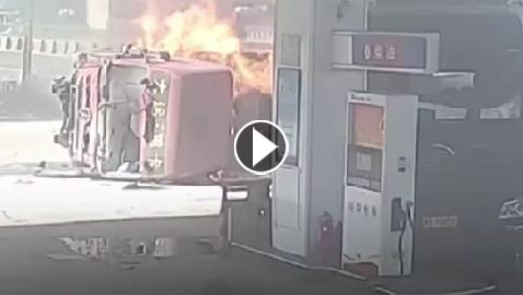 فيديو مروع.. انفجار شاحنة بعد تحطمها في محطة وقود