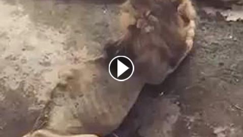 لقطات مروعة لأسد هزيل يموت ببطء داخل قفصه بسبب نحافته ..