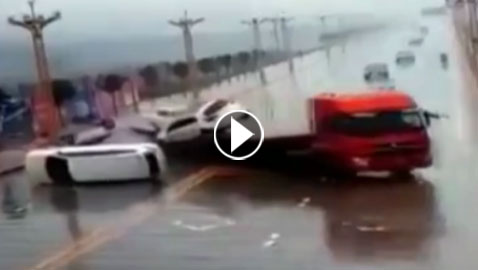 فيديو صادم.. شاحنة نقل سيارات تتعرض لحادث مروع