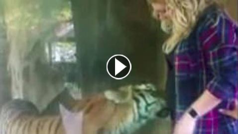 فيديو مذهل.. نمر يتعاطف مع امرأة حامل ويربت على بطنها بلطف