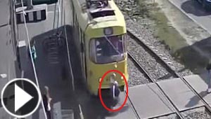 فيديو مروع.. شغلها الهاتف عن أضواء التحذير فصدمها ترام وزحف ..